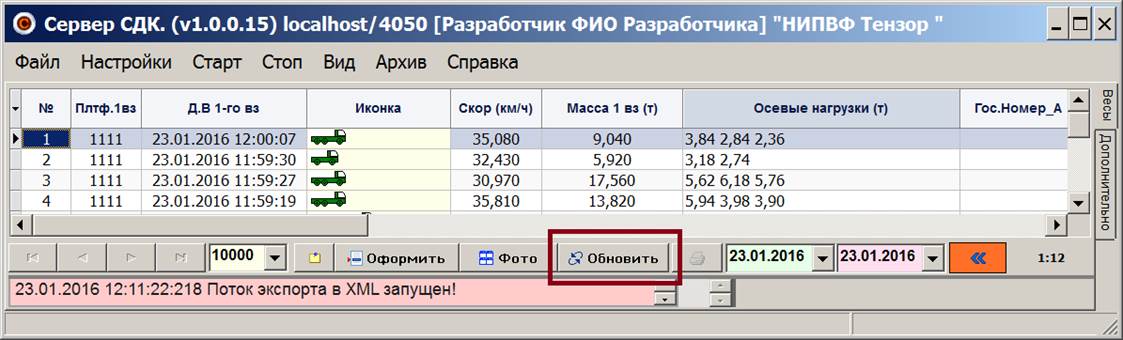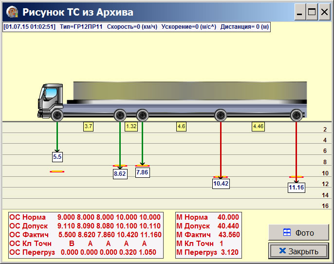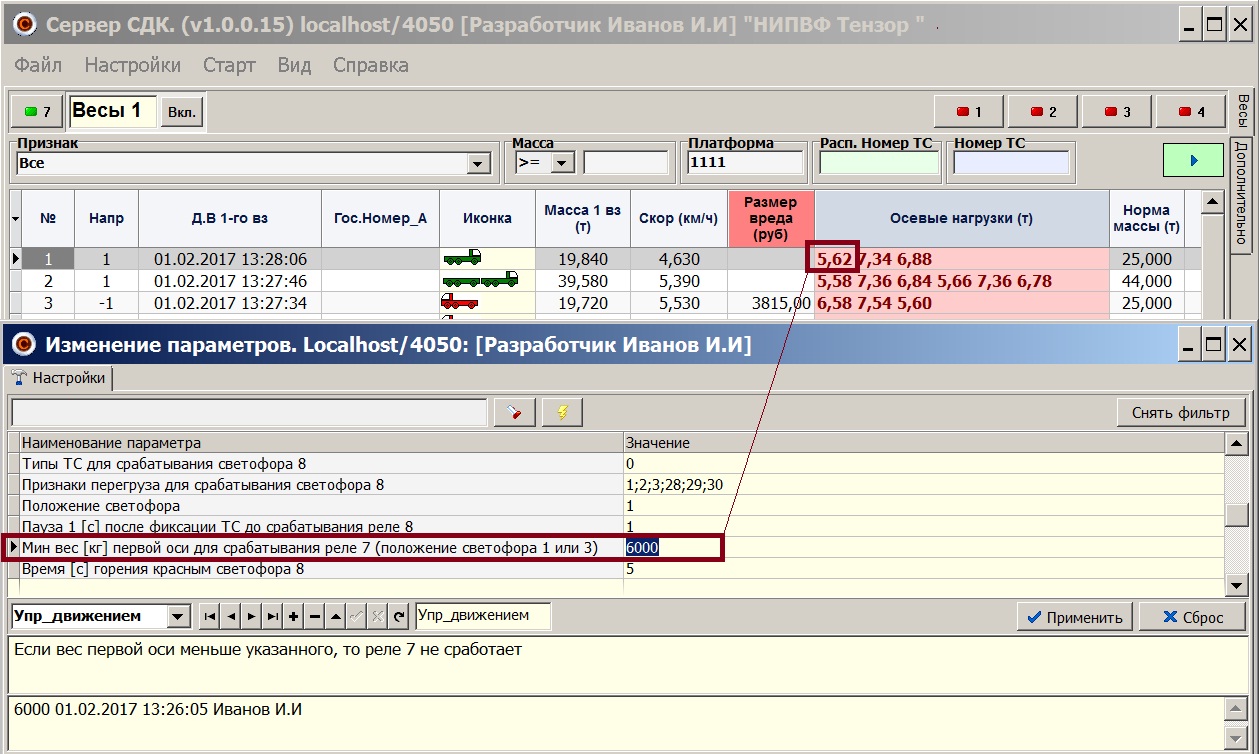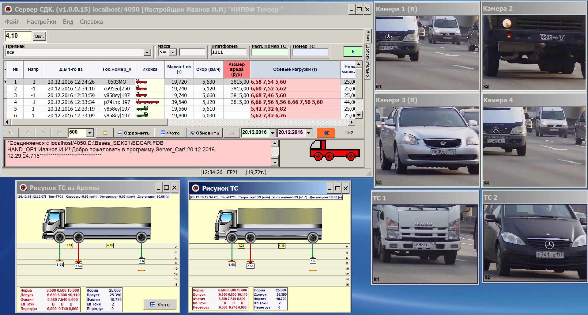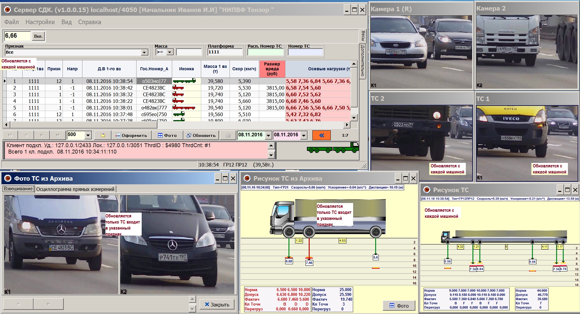 ПО Системы дополнено сервисной функцией автоматической проверки соответствия измеренных значений осевых нагрузок и массы ТС требованиям действующих нормативных документов (ограничивающих массы и нагрузки осей ТС на дорожное покрытие). Обеспечено также формирование и ввод в базу данных (архив) дополнительных сведений о ТС - характеристиках груза, данных о перевозчике и маршруте движения.