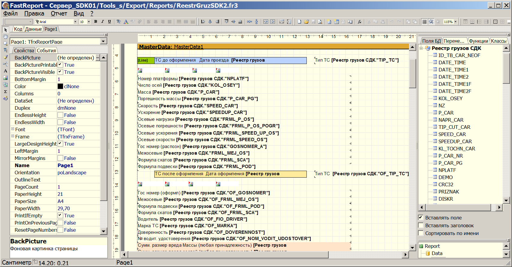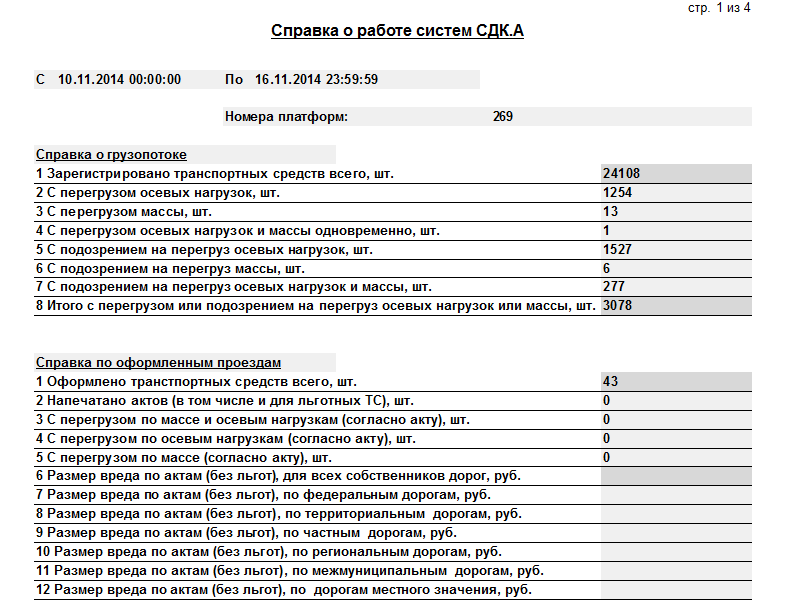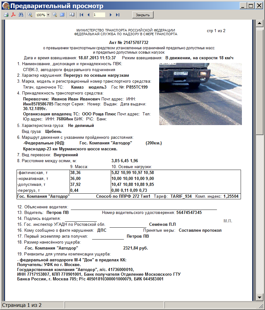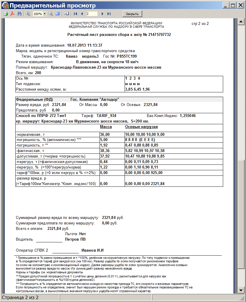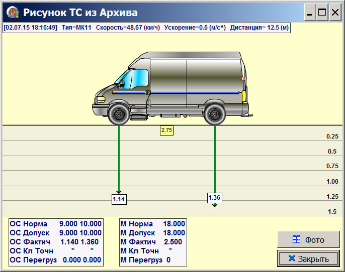 ПО Системы дополнено сервисной функцией автоматической проверки соответствия измеренных значений осевых нагрузок и массы ТС требованиям действующих нормативных документов (ограничивающих массы и нагрузки осей ТС на дорожное покрытие). Обеспечено также формирование и ввод в базу данных (архив) дополнительных сведений о ТС - характеристиках груза, данных о перевозчике и маршруте движения.