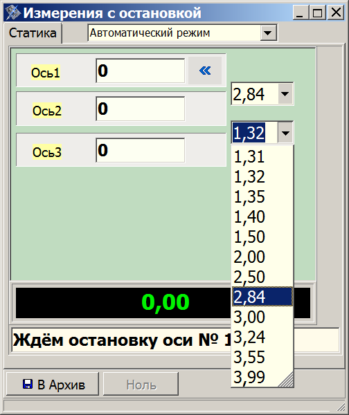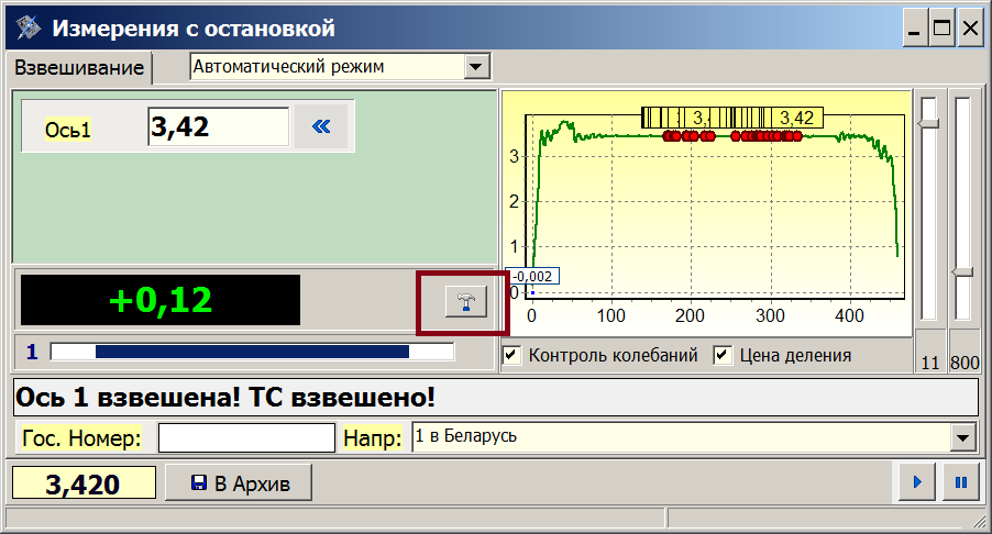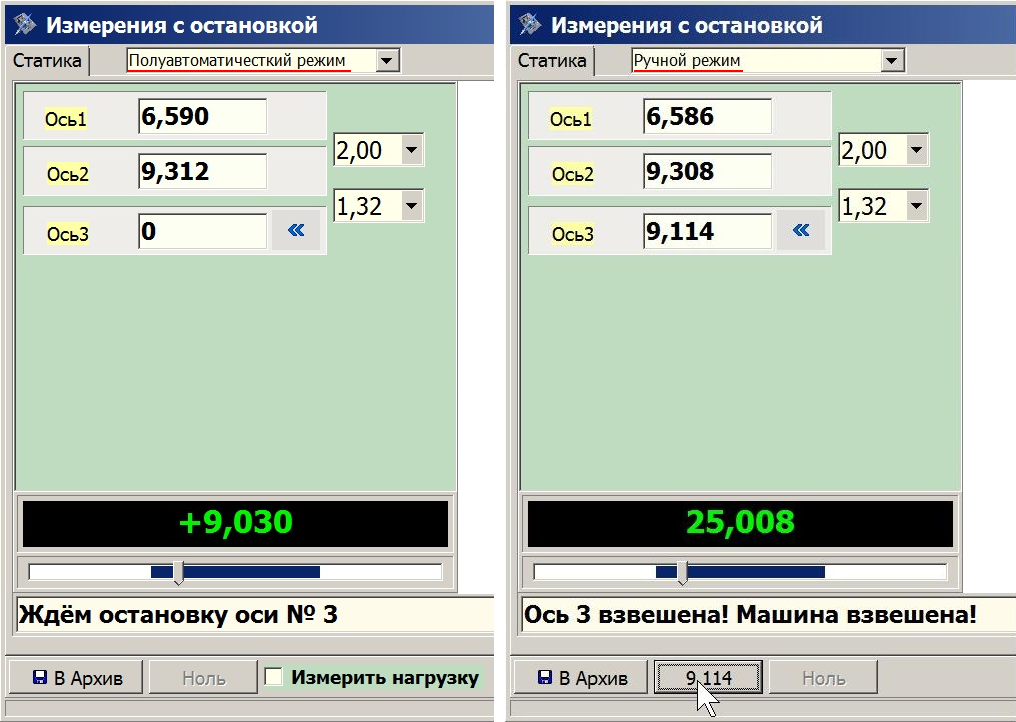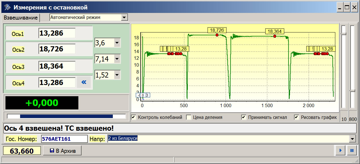 в полуавтоматическом режиме по команде оператора «Измерить ось» значение осевой нагрузки ТС определяется автоматически при стабилизации показаний,