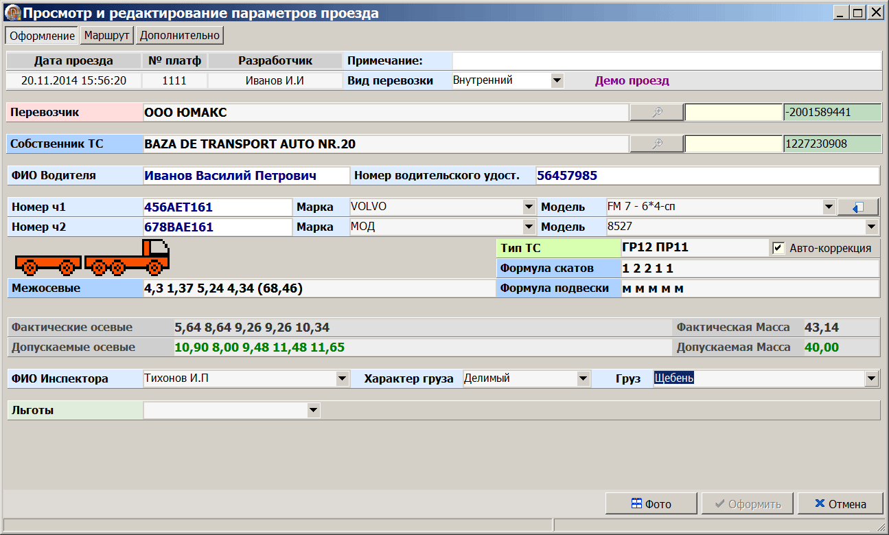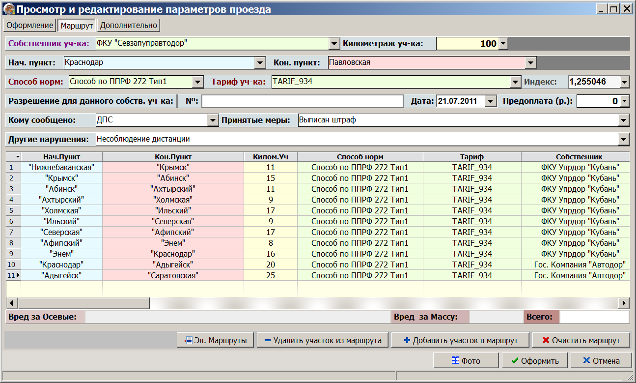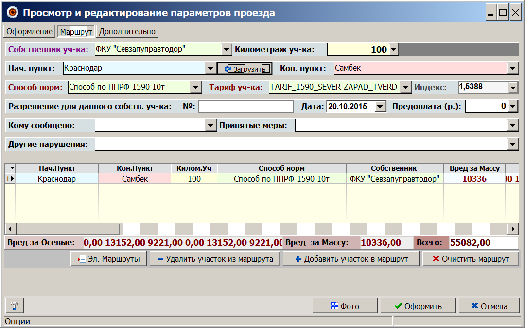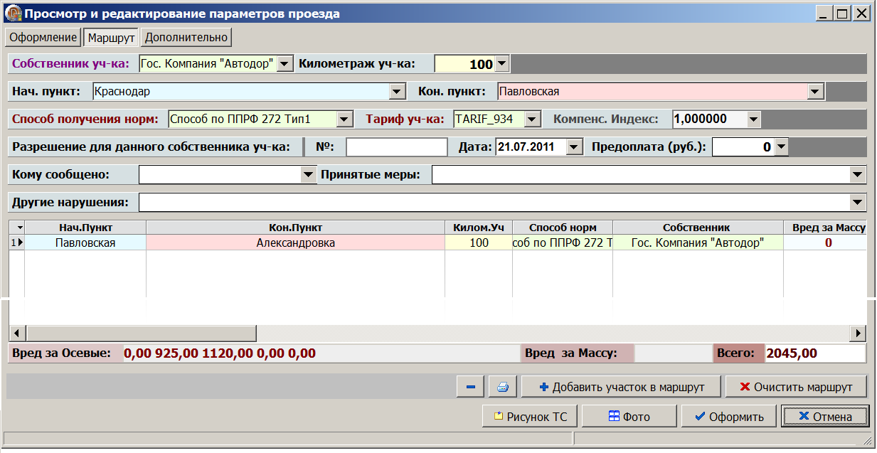 Применяется на заводах, предприятиях где при оформлении акцент делается не на проводе ТС по участкам маршрута с разными нормами перегруза, а на быстрое взвешивание и определение перегруза по заранее заданным параметрам базовой модели, но это не мешает в любой момент добавлять и другие участки маршрута с другими параметрами (нормы, собственник, коэфф. инфляции и т.д.). При таком виде оформления оператору надо лишь нажать одну кнопку ОФОРМИТЬ, программа автоматически считает из настроек заранее определённые параметры проезда (в Опти)