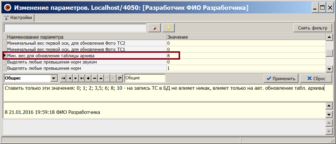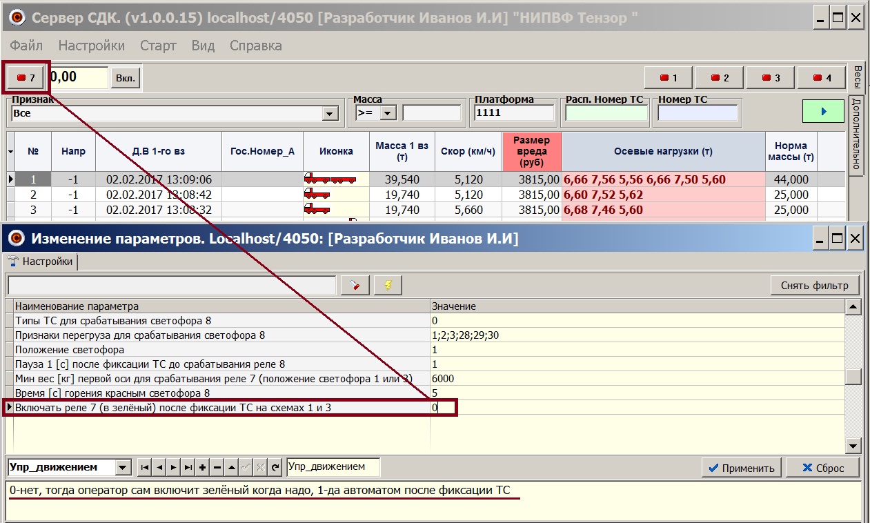 Раньше при наезде первой оси ТС реле 7 безусловно срабатывало (светофор красный), и оно было включённым вплоть до фиксации веса всего транспортного средства, и это работало для транспортных средств любого веса. Теперь появилась возможность не делать эту процедуру, если первая ось ТС недостаточно весит (а у нас в данный момент только и есть, что приблизительный, не уточнённый вес именно первой оси, машина ещё даже не проехала по весам, а только наехала первой осью). Нижний предел фиксируемых ТС и устанавливает данная опция. Например, если поставить 1000 кг, то на машины с весом первой оси менее 1000 кг, реле и, стало быть, светофор срабатывать не будут, а на машины с весом более 1000 кг, сработают. Этот предел устанавливается эмпирически, исходя из качества трафика и кривых проезда, так как предварительный вес в момент наезда (не уточнённый специальными алгоритмами) обычно имеет значения, близкие к максимуму на осциллограмме проезда, а реальный, фактический вес оси, видимый в программе, будет чуть ниже. Поэтому данное значение подбирается по месту, исходя из текущих условий. Данная опция может быть востребована на переправах, мостах, карьерах, заводах, полигонах и везде, где требуется регулировать данным способом (1 или 3) только проезд грузовых транспортных средств.