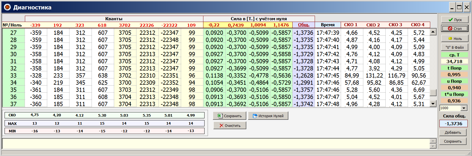 - диагностика измерительных каналов ГПУ с раздельной индикацией нагрузки на каждый датчик и оценкой среднеквадратичного отклонения, а также максимального и минимального отклонений значений от среднего по выборке измерений.