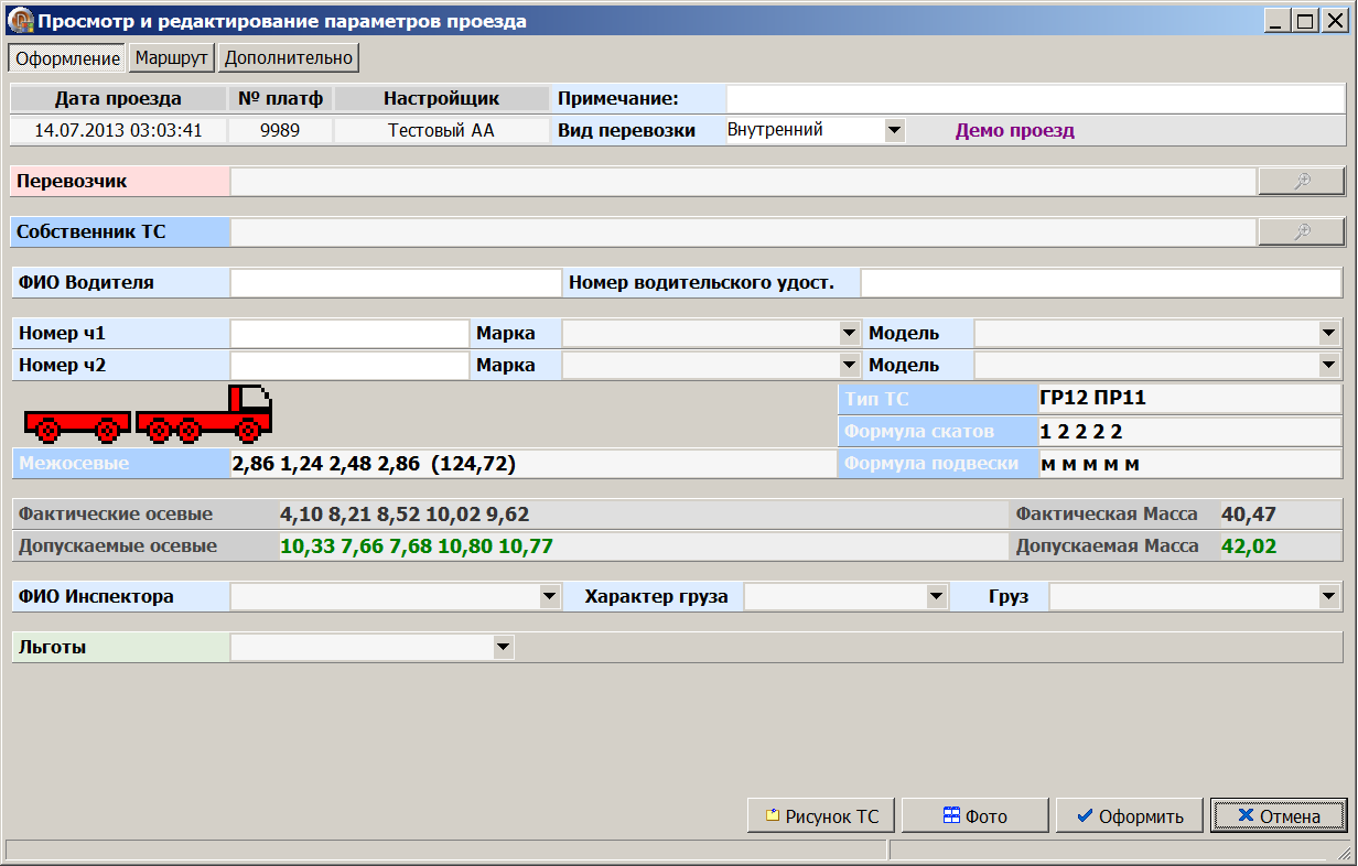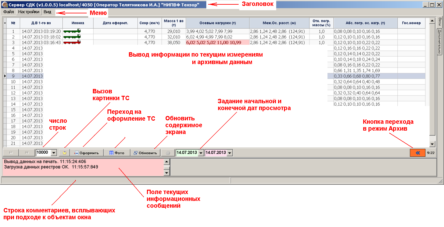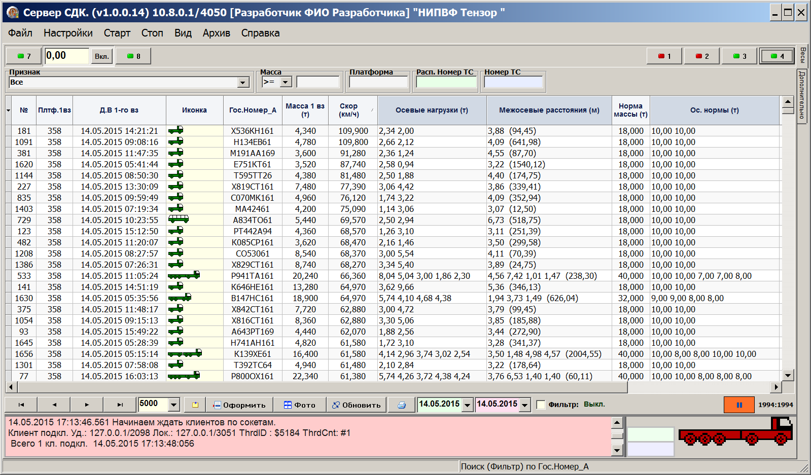- ввод оператором сопутствующей информации о ТС, отображение на экране ПК сохраненных данных с визуальным отделением данных, полученных из Клиента;
