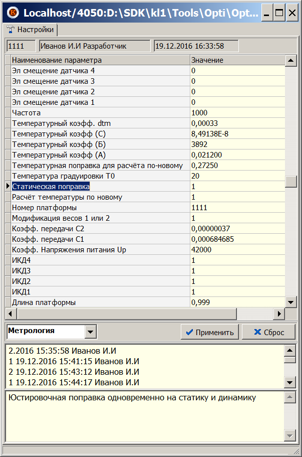 11.2 Теперь при работе из-под настройщика (обычно при настройке весов или при поверках) появилась возможность регулировать статическую юстировочную поправку, прямо из окна "Статическое взвешивание", причём изменения коэффициента сразу же приводят к изменению веса.